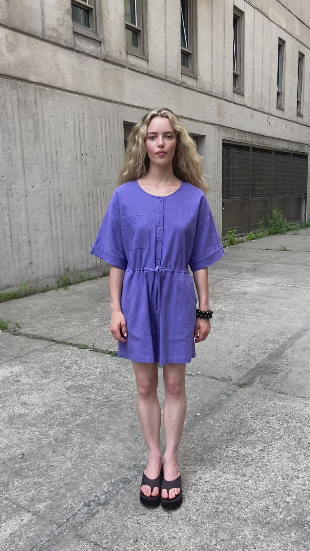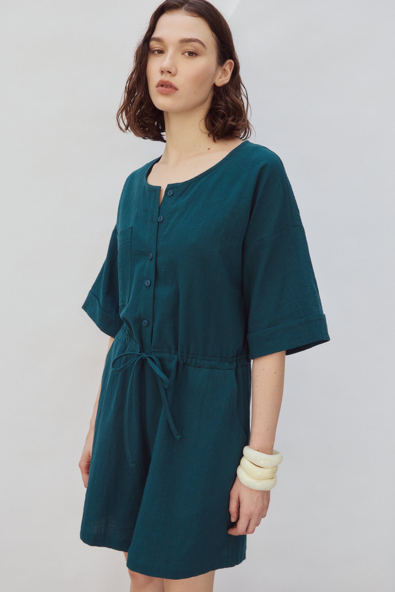 Discover this playsuit with a round neck, featuring a stylish button-front closure, two side pockets, and a drawstring waist for a customized fit. We love its generous elbow-length sleeves, subtly finished with a turn-up. Made from slub cotton, its lightweight, textured fabric guarantees optimal comfort all day long.