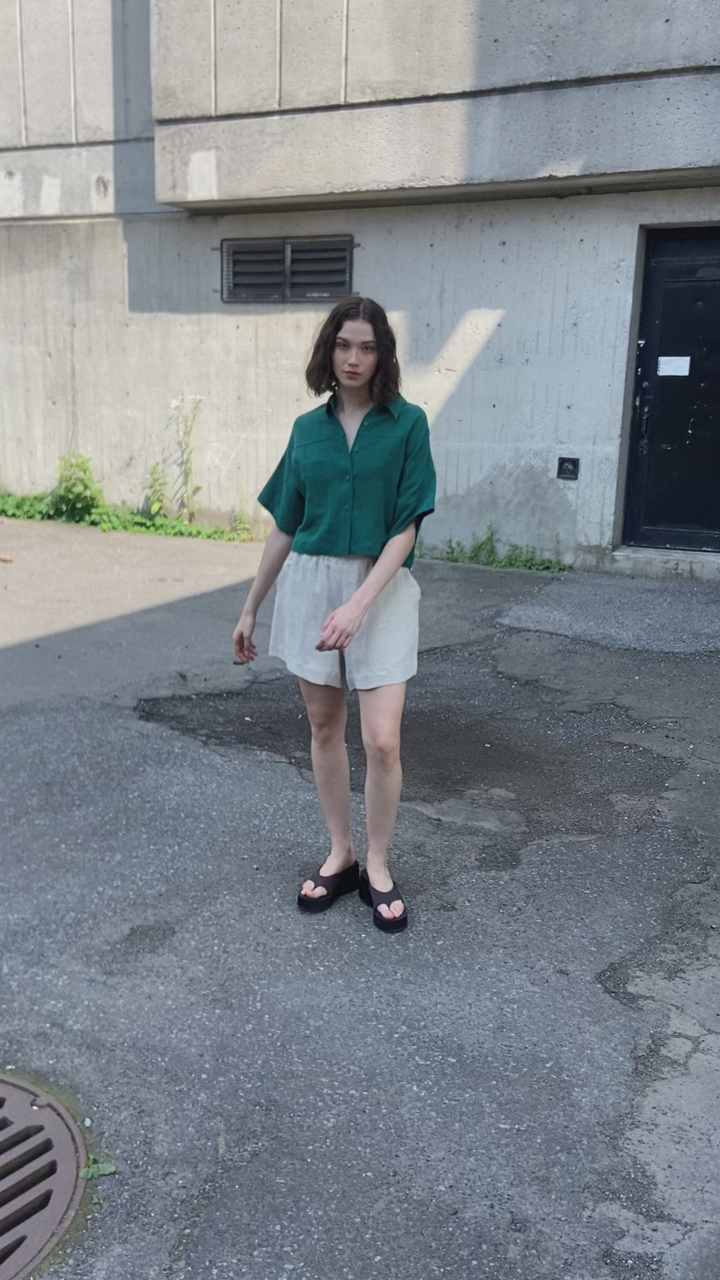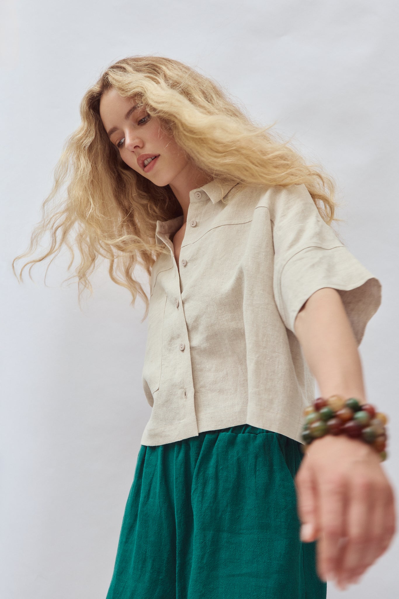 Embrace Eve Gravel's signature style with this boxy cropped shirt featuring oversized, three-quarter-length sleeves. Thoughtful details include a chest pocket on the right, a discreet button placket, and a classic collar. A modern, minimalist fit you'll never tire of!