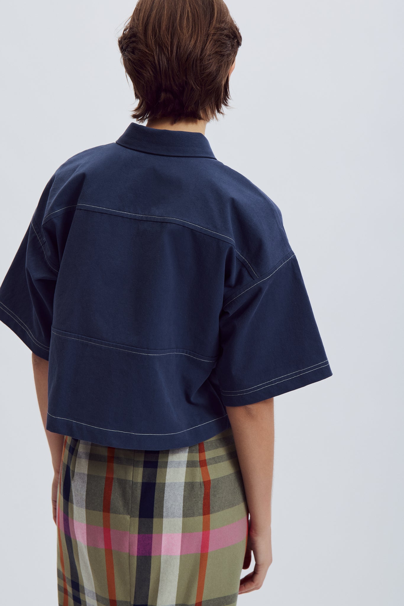 A short, loose-fitting shirt with short sleeves in a structured fabric to accentuate its boxy look. It features two chest pockets and pairs perfectly with the THÉANO pants to create a coordinated look. Contrasting stitching and elegant cutouts add an extra touch of sophistication.