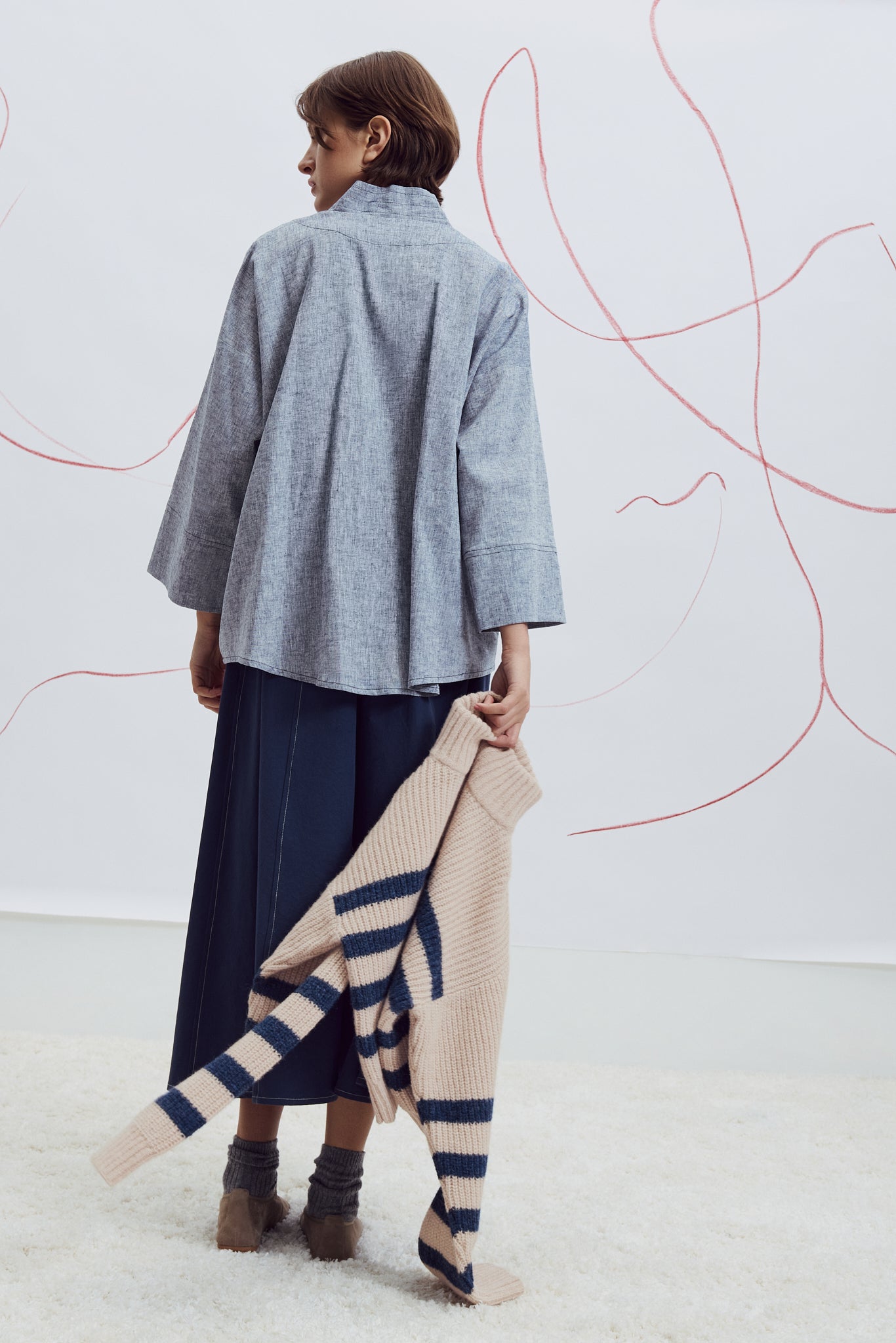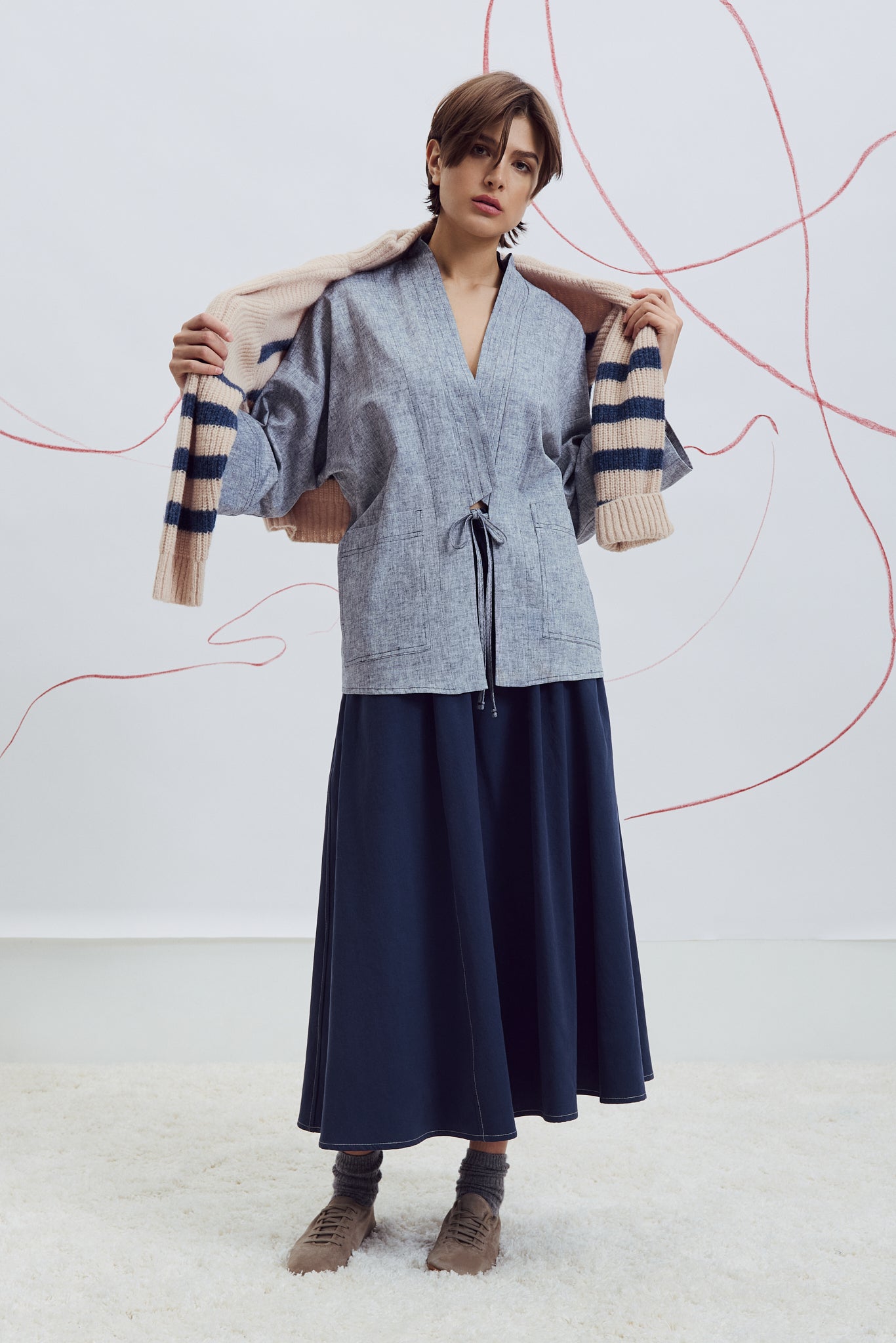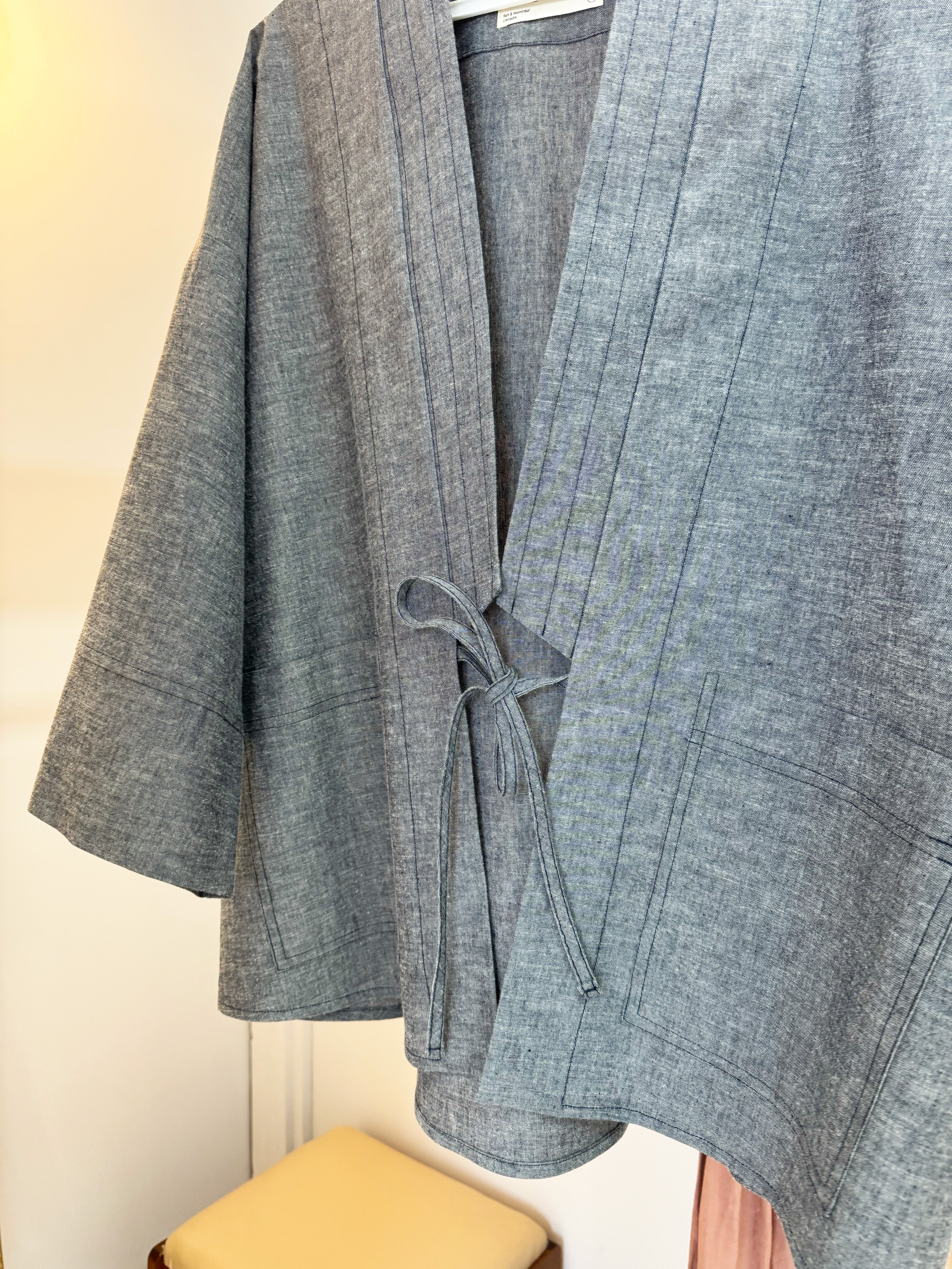 Kimono-style top with front tie closure. It features two patch pockets and a slightly oversized fit, ideal for wearing over a turtleneck during winter.